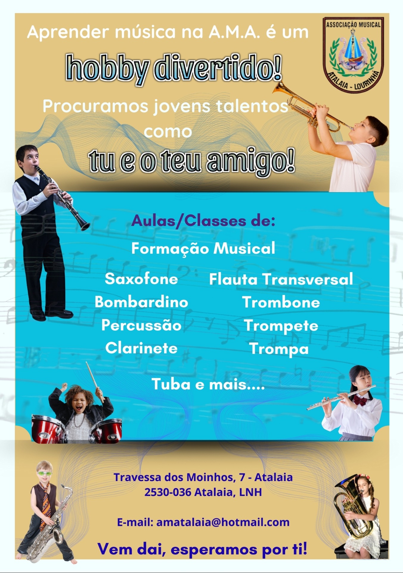 A convite, as portas da Associação Musical de Atalaia encontram-se sempre abertas a todos os que queiram aprender a tocar um instrumento ou a participar na arte de fazer música.