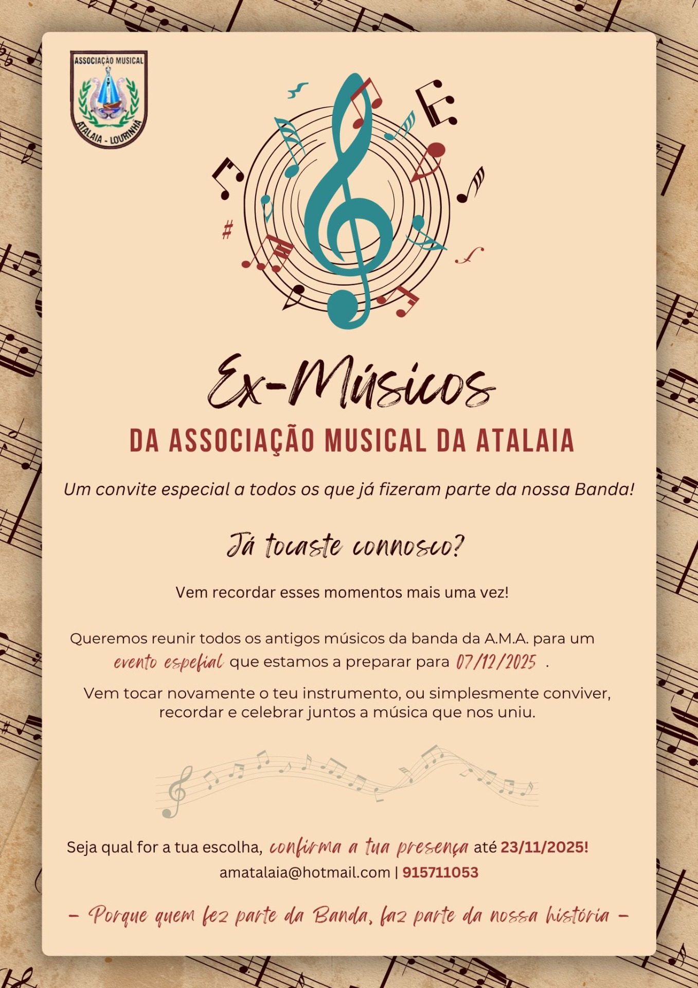 O 39º Aniversário da A.M.A. será celebrado no dia 07/12/2025 (cartaz a ser divulgado brevemente), no seguimento das comemorações, convidamos os todos os ex-músicos da Associação a participarem do evento!